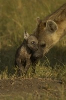 Above, left: An adult spotted hyena greets a 'black' pup, a very tiny pup. Middle left: An olive baboon gestures in a dance-like move. Middle right: Colobus monkey portrait. Right: An olive baboon skips across a shallow river on its hind legs.