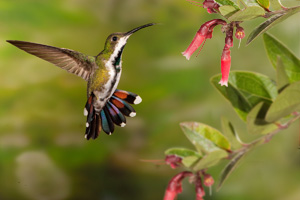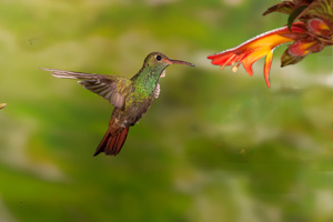 Second row, rufous-tailed hummingbird, background real (meaning