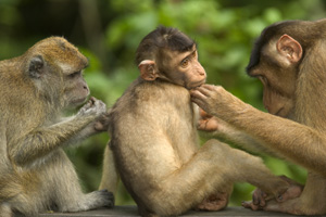 young short-tailed or curly-tailed Macaque monkey was being groomed