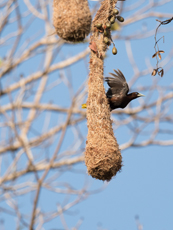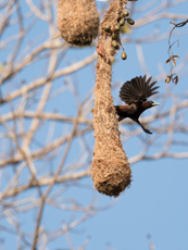 One of the features of the Olympus camera I'm using (OMD-E Mark II) is ProCapture, where 14 frames are recorded PRIOR to the shutter actually being fully depressed. With the camera shutter half-pressed, the camera records images in the buffer but doesn't write to the card. So long as the shutter is half-pressed the camera continually records, rewriting over the last frame in a continuous loop. I fired when this Crested Oropendula left its nest, and in my reaction time I only caught the nest, without a bird in the frame. However, via ProCapture I also recorded the 14 previous frames, which captured the bird in flight and while it still hung on the edge of the nest, the instant before launching. With ProCapture I'm capturing shots I've usually missed in the past.