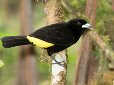 I explored the jungle on our first day here, where I spent nearly three quiet hours, alone and unhurried, with a lek of very noisy Golden-collared Manakins. When I entered the jungle I could hear the snaps and buzzes of Manakins, and I climbed uphill along the trail for a closer looks. The birds were hidden, but luckily I noticed a couple of patches of bare earth on the otherwise leaf-covered forest floor and, either from watching nature videos or from my reading, I recognized the patches as the sign of a breeding lek. I stopped, and waited, and five or ten minutes later the first birds returned, snapping their wings and trilling a buzzing note, then rapidly hopping back and forth from one low branch to another, to fast for me to focus a lens. More birds joined in, and eventually I had Manakins all around me, calling and, luckily, perching for longer periods, sometimes only a few yards away. It was one of the highlights of the trip.