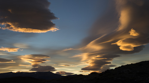 Day 2. Wind. We awoke at 3:15AM and the Towers were framed by a field of brilliant stars. By 3:50 we were on the road, and arrived at our scouting area just as the skies began to lighten, making the use of the expensive thermal imaging scope unnecessary. Guanacos were whistling an alarm, a good sign that a puma had been sighted, but we couldn’t spot the cat. The skies were spectacular, however, and diverted our attention as we photographed the incredible lenticular clouds, glowing orange and yellow, in a very heavy wind.